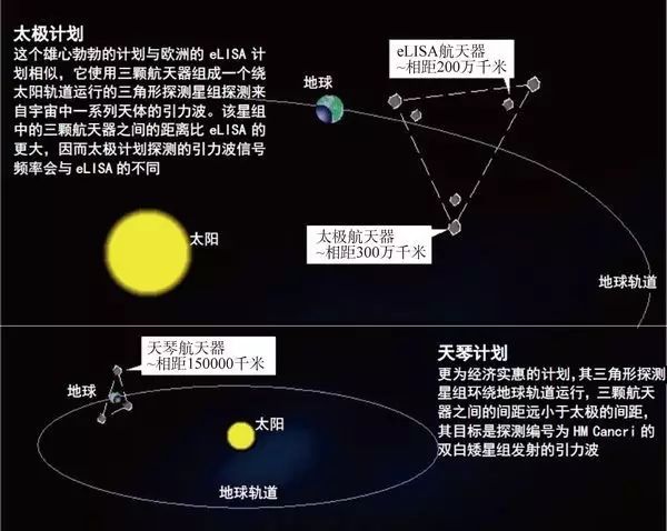 中国科学院空间引力波探测计划源于胡文瑞院士从2008 年开始组织中国科学院和相关高校的有关专家的论证和方案设计,该空间引力波探测计划于2016年初命名为太极计划,其方案也是三颗星的编队围绕太阳运动(类似于eLISA, 不同之处主要在于其臂长为300 万千米)。中山大学与华中科技大学的天琴计划