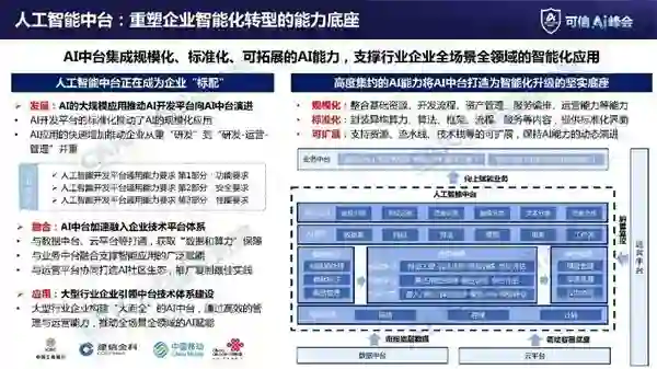 通过与数据中台、云平台、业务中台、运营平台的打通,AI中台正在加速融入企业的技术平台体系中。当前阶段,大型的行业企业正在积极构建AI中台体系,通过高效的组织管理实践,推动全场景全领域的AI赋能。