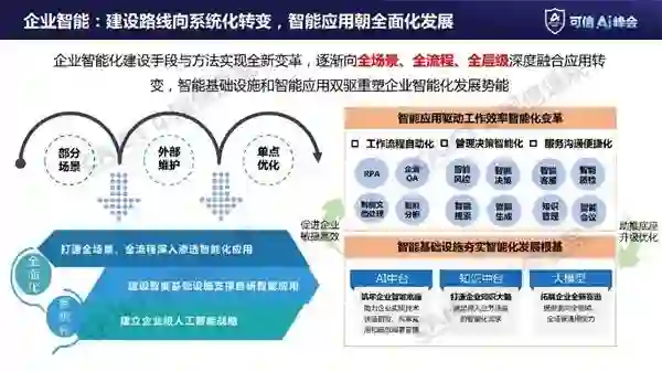 企业智能化建设手段与方法实现全新变革,逐渐向全场景、全流程、全层级深度融合应用转变。随着智能化技术的不断发展和应用深入,企业智能建设从部分场景、外部维护、单点优化逐渐向系统化、全面化转变,通过智能基础设施和智能应用双驱重塑企业智能化发展势能。