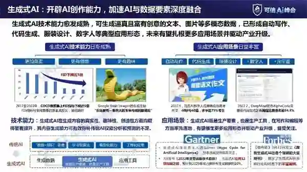 生成式AI开辟AI创作能力,加速AI与数据要素深度融合。近几年生成式AI的技术能力越来越成熟,可生成逼真且富有创意的多模态数据,形成自动写作、代码生成、数字人等典型的应用形态,已连续两年入选《人工智能技术成熟度曲线报告》。