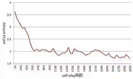 在训练过程中,除了观察到损失函数在慢慢减小,我们一般还会关注策略价值网络输出的策略(输出的落子概率分布)的 entropy 的变化情况。