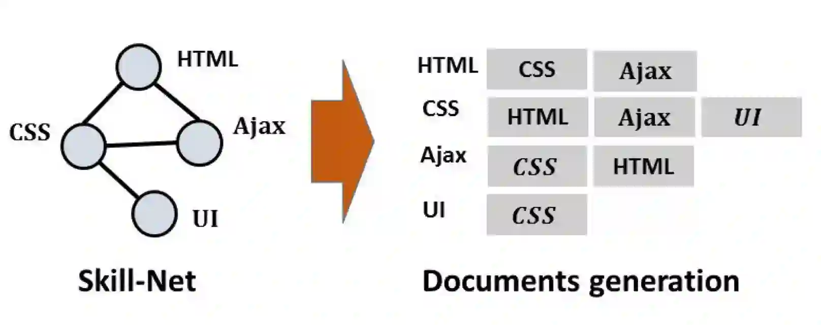 具体而言,首先基于技能在招聘需求中的共现度,构建了用于表示技能间关联性的网络(Skill-Net),接着将每个技能构成的自我网络(ego-network)当作文档,相邻技能节点作为单词进行建模。
