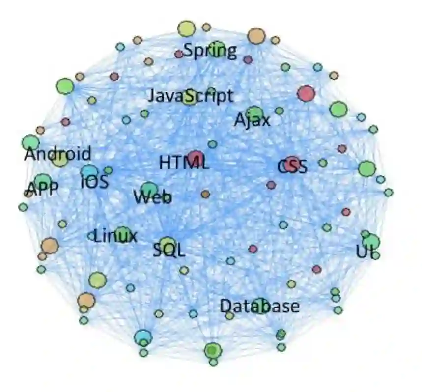2. 技能需求从来不是独立存在的,而是存在很强的潜在关联性。例如「node.js」和「Javascript」常常一同出现,却绝少和「machine learning」出现在同一个工作需求中。