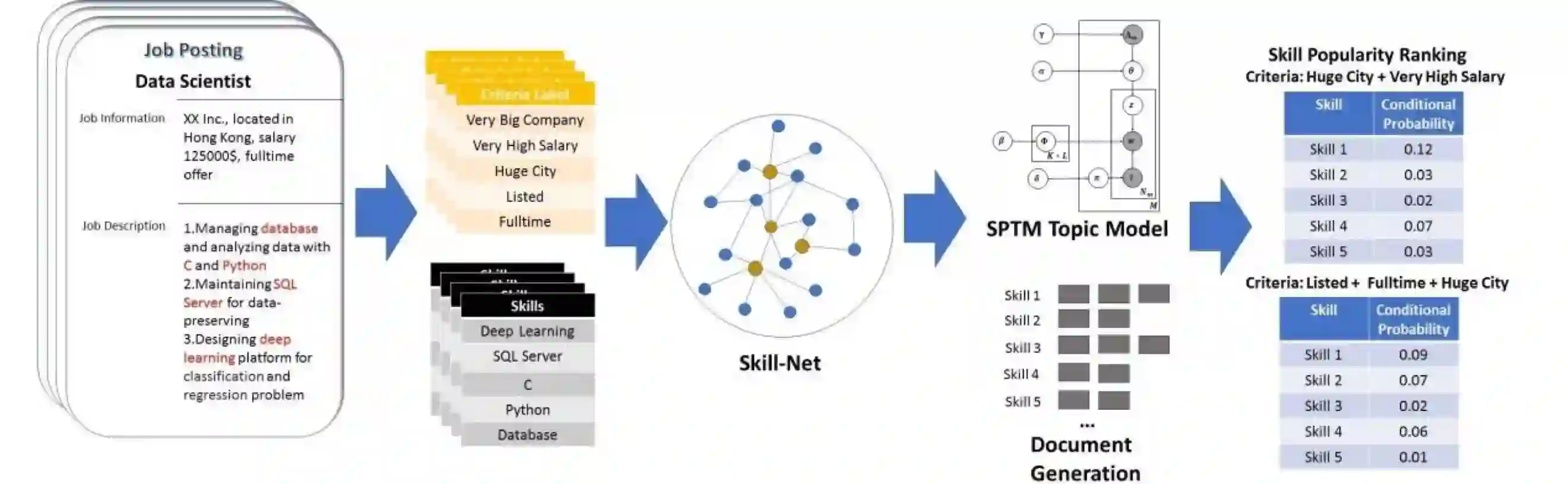在此基础之上,通过借鉴主题模型(topic modeling)的思想,作者们提出了技能流行度主题模型 SPTM(Skill Popularity Topic Model),来建模技能间的共现关系。