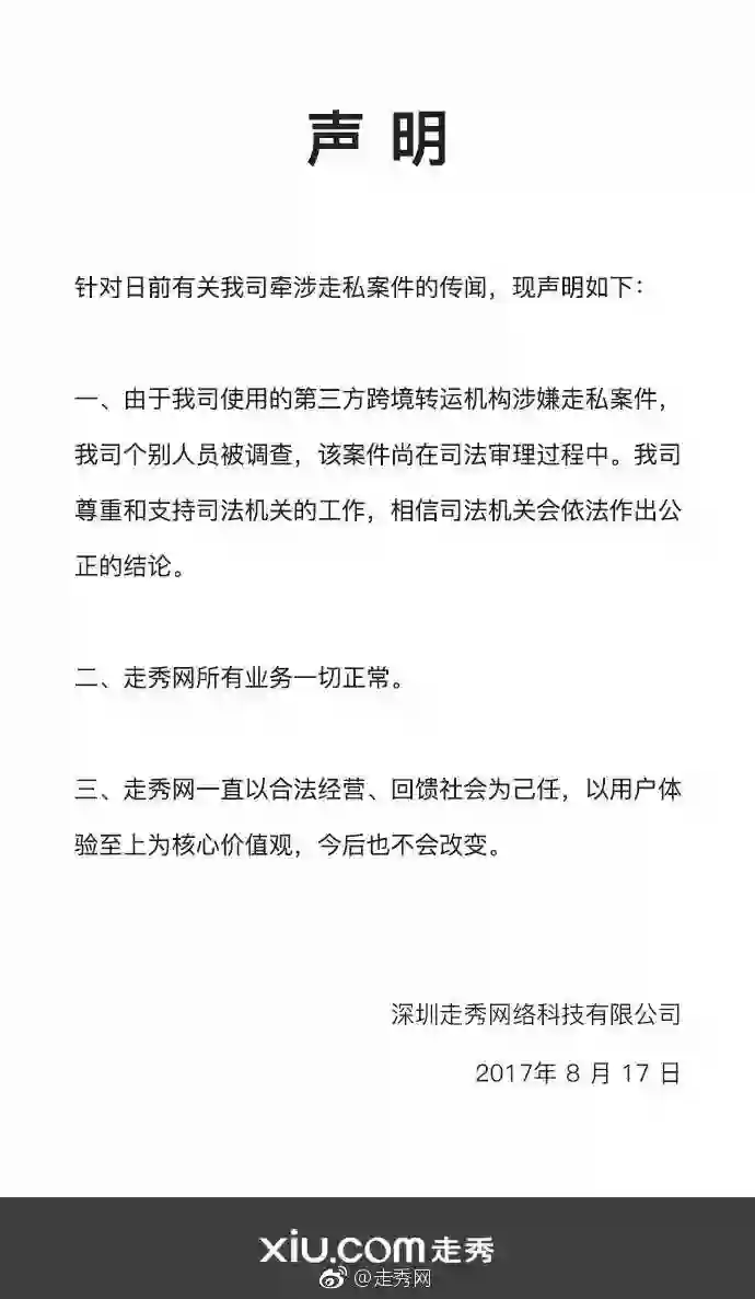 昨日下午16:10,走秀网官方微博发布一则声明,表示“由于使用的第三方跨境转运机构涉嫌走私案件,个别人员被调查,该案件尚在司法审理过程中。尊重和支持司法机关工作,相信司法机关会依法作出公正的结论。走秀网所有业务一切正常。走秀网一直以合法经营、回馈社会为己任,以用户体验至上为核心价值观,今后也不会改变。”