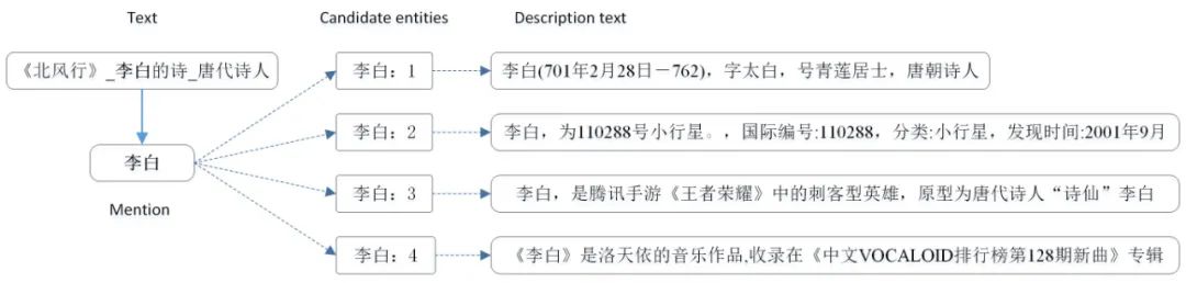 候选实体生成最常用的方法是基于字典的方法 [4,5],这种方法需要根据给定的知识库构建名称字典,字典的键就是实体的名字,而值则是这个名字所对应的所有的具有相同名字的实体。
