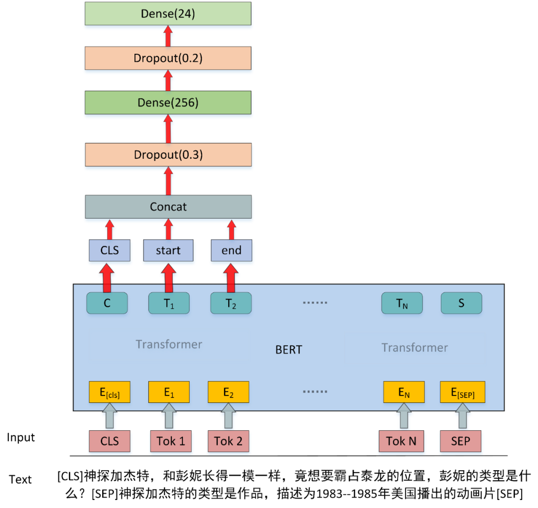 这种方案的最大缺点就是仅仅用短文本的信息去对 NIL 实体进行类型分类,没有利用到已知实体信息的特征,为了利用上其他不是 NIL 实体的信息,我们构建了基于问答的实体类型判断模型。模型基于问答的思想,通过构建问句和上下文将已知实体的信息输入到模型中,来提升实体类别判断的性能。
