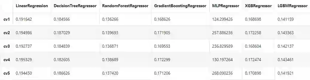 score = np.mean(cross_val_score(model, X=train_X, y=train_y_ln, verbose=0, cv = 5, scoring=make_scorer(mean_absolute_error)))