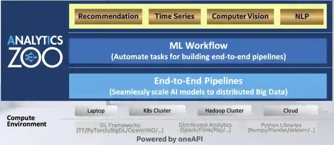 Analytics Zoo 在底层可提供端到端的数据流水线的能力,能够帮助开发者直接无缝地将 AI 模型运行在其分布式大数据上;中间层可提供机器学习的工作流,目的是能够将很多人工的作业、人工的任务变成自动化;在最上层,则能构建不同应用场景,快速开发例如推荐系统、时间序列分析、计算机视觉、以及自然语言处理等方面的应用。