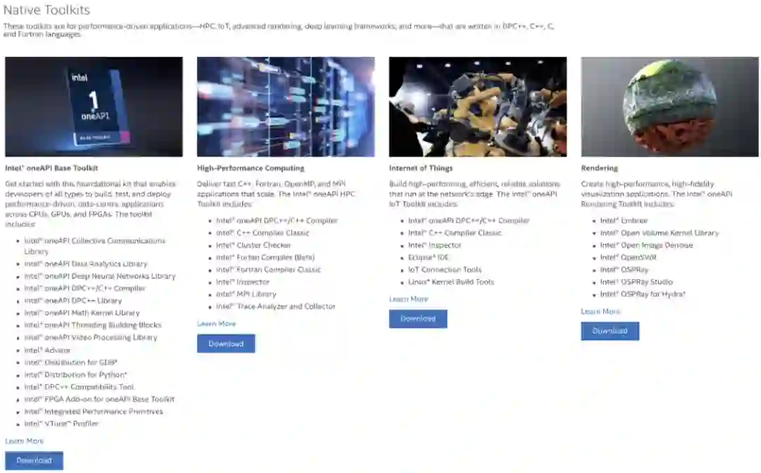 oneAPI 是英特尔 “软件先行” 战略一种体现,毕竟,展开硬件新布局之前,让开发者爱上自己的工具乃至离不开这些工具的便捷性,是芯片制程、性能之外最重要的市场抓手。就目前官方提供的下载内容来看,除了跨平台基础开发套件之外,重点的工具也包括了高性能计算、物联网和高级渲染层面的工具整合。