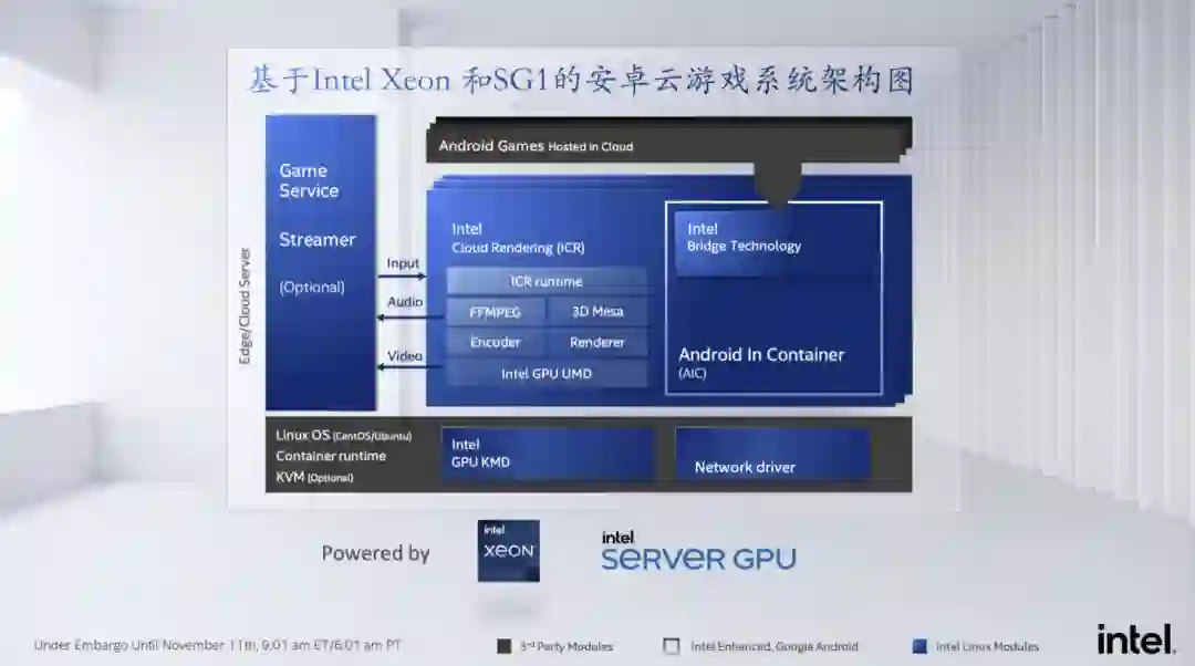 而在 CPU 端,英特尔把安卓用比较轻量级云原生的技术,用容器化的技术把它跑到轻量级的容器当中,提供云端协同的创新应用。值得一提的是,英特尔在安卓的框架层和运行层都做了非常多的优化,能使安卓容器化方案做到很高的密度,这些方案目前正在进行测试,可能会比较快的看到产品化的实现。