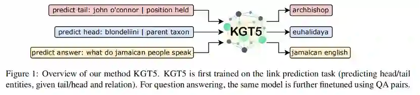 KGT5 首先在链接预测任务上进行训练(预测头/尾实体,给定尾/头和关系)。对于问答,使用 QA 对进一步微调相同的模型。方法的概述图如下: