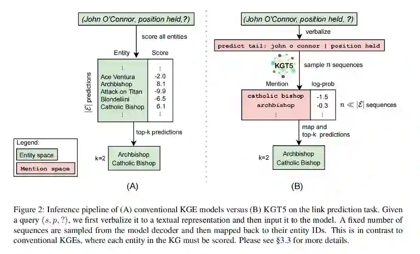 在传统的 KGE 模型中,通过找到分数 来回答查询 (s, p, ?),其中 f 是特定于模型的评分函数。然后根据分数对实体 o 进行排名。在KGT5中,给定查询 (s, p, ?),首先将其进行描述,然后再将其提供给 KGT5。然后,从解码器中采样固定数量的序列,然后将其映射到它们的实体 ID。通过使用这样的生成模型,能够近似(以高置信度)top-m 模型预测,而无需对所有模型进行评分KG 中的实体,正如传统的 KGE 模型所做的那样。对于每个解码的实体,为其分配一个等于解码其序列的(log)概率的分数。