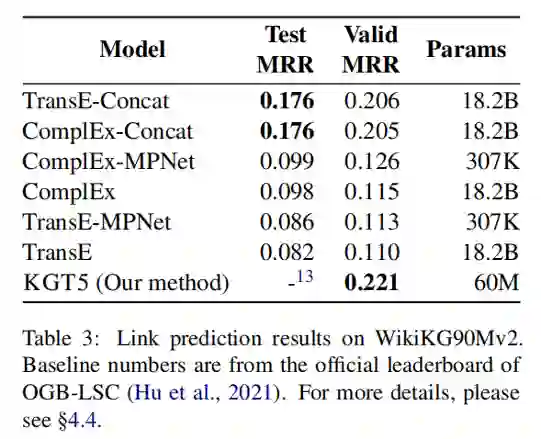 类似地,下图显示了在WikiKG90Mv2上的链路预测性能。可以看出,KGT5在验证集上获得了最高的MRR,同时比排行榜上表现最好的模型少98%。