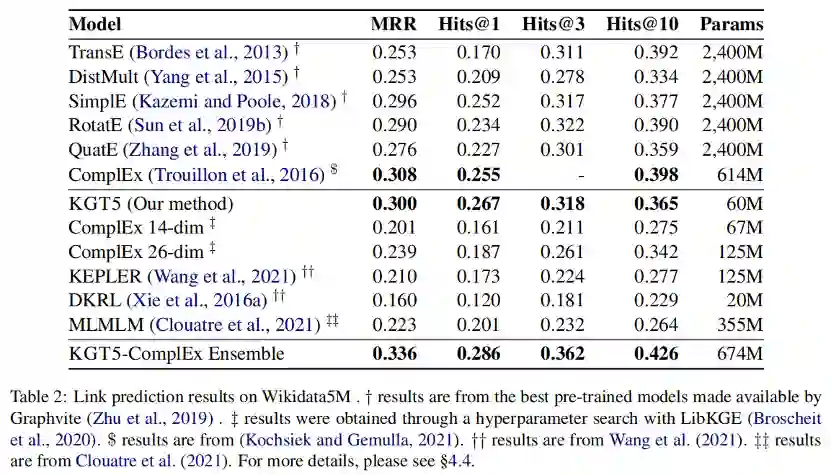 下图显示了 Wikidata5M 上的链接预测性能,这是一个更小但研究得更好的 KG。可以看到 KGT5 在所有指标上都优于所有低参数计数模型。与大型 ComplEx 模型相比,MRR 下降了 0.008 点,而 hits@1 则增加了 0.012 点。