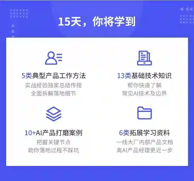 《15天入门AI产品经理》即将于4月2日开课,录播课程报名即可开启学习。早鸟优惠最后一天,报名立减100元!