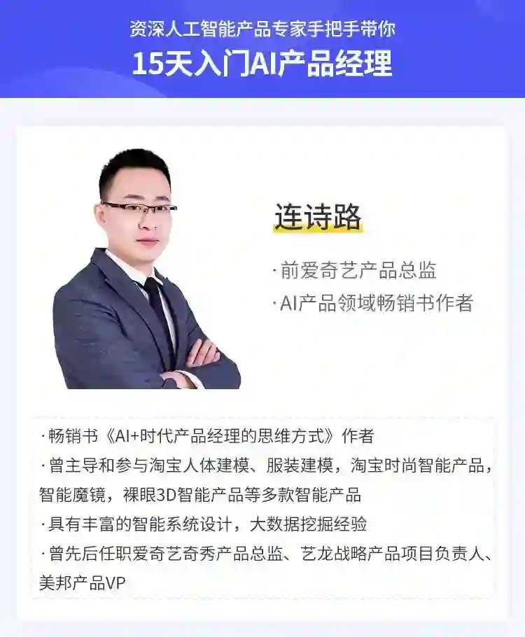 在15天的课程中,连诗路老师将用其多年的实战和研究,带大家深入到行业最前沿,不仅分享了做AI产品的产品观点、产品打磨流程、AI产品需要的资源、AI产品发布运营等方面的实践,也对同学们入门AI产品经理岗位未来需要深度学习的方向提供了建议。