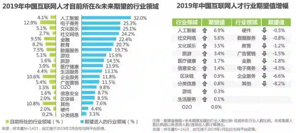 根据艾瑞咨询对拉勾网用户的调研显示,目前在人工智能行业工作的人占4.1%,未来期望进入该行业的人占32%,这意味着有更多的求职者期望在人工智能领域发展。