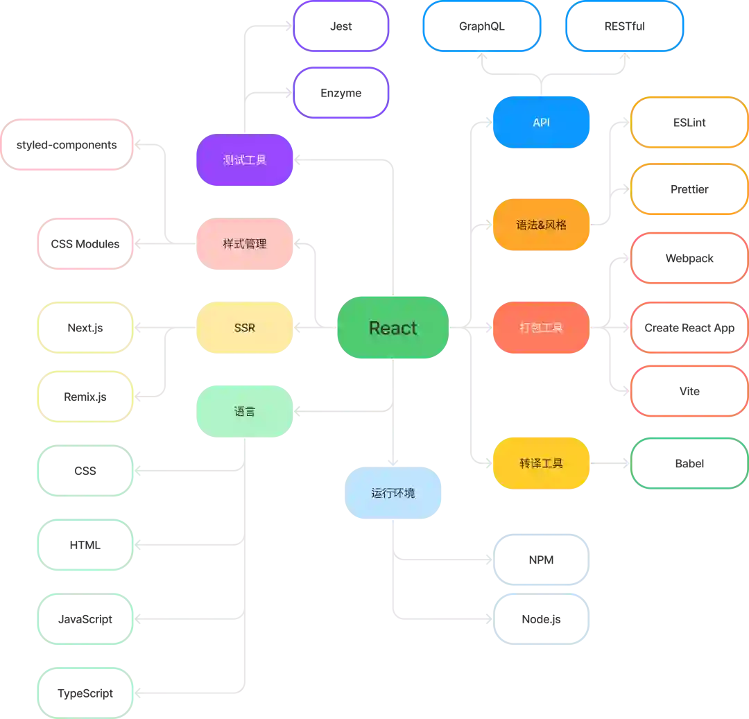 乍一看要掌握的有很多,但很多库都是随着 React、Vue 等最重要的前端库自然而然地引入进来的,大部分的用法都很简单,并且我们还会在工作中持续学习,一开始只需要入门就行。下图展示了 React 前端开发工程师,根据 React 框架所衍生的技术栈(示意):