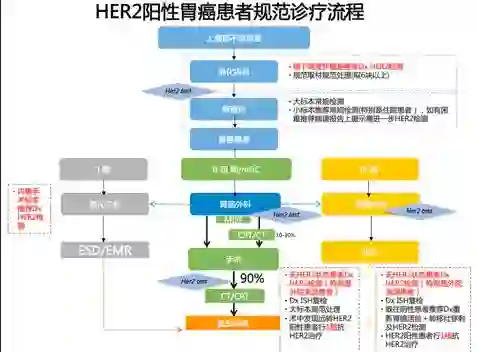精准的HER2检测需多学科间共同合作,目前中国专家已经制定了HER2阳性胃癌患者规范诊疗流程,总结见下图。