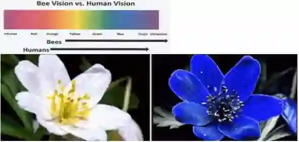 图2 人与蜜蜂视觉的差异[1]; 下图:人眼中的白花(左)与蜜蜂眼中的白花(右)