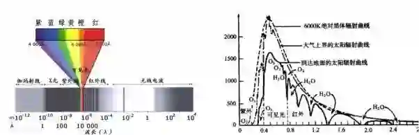 图1 左:电磁波谱与可见光;右:电磁波在进入地球大气后的分布