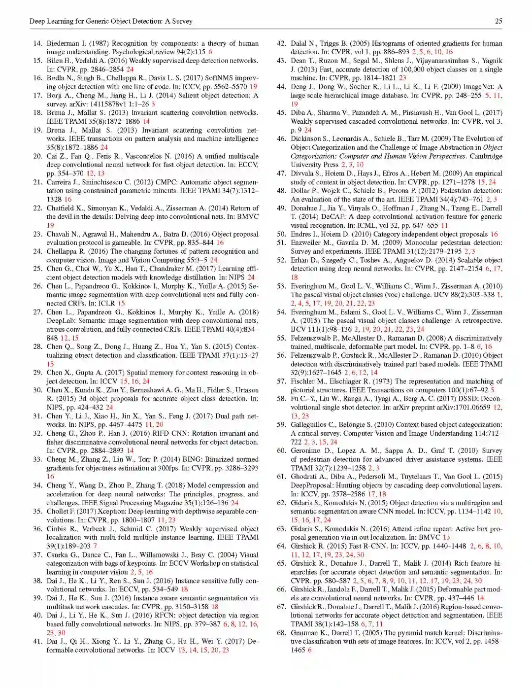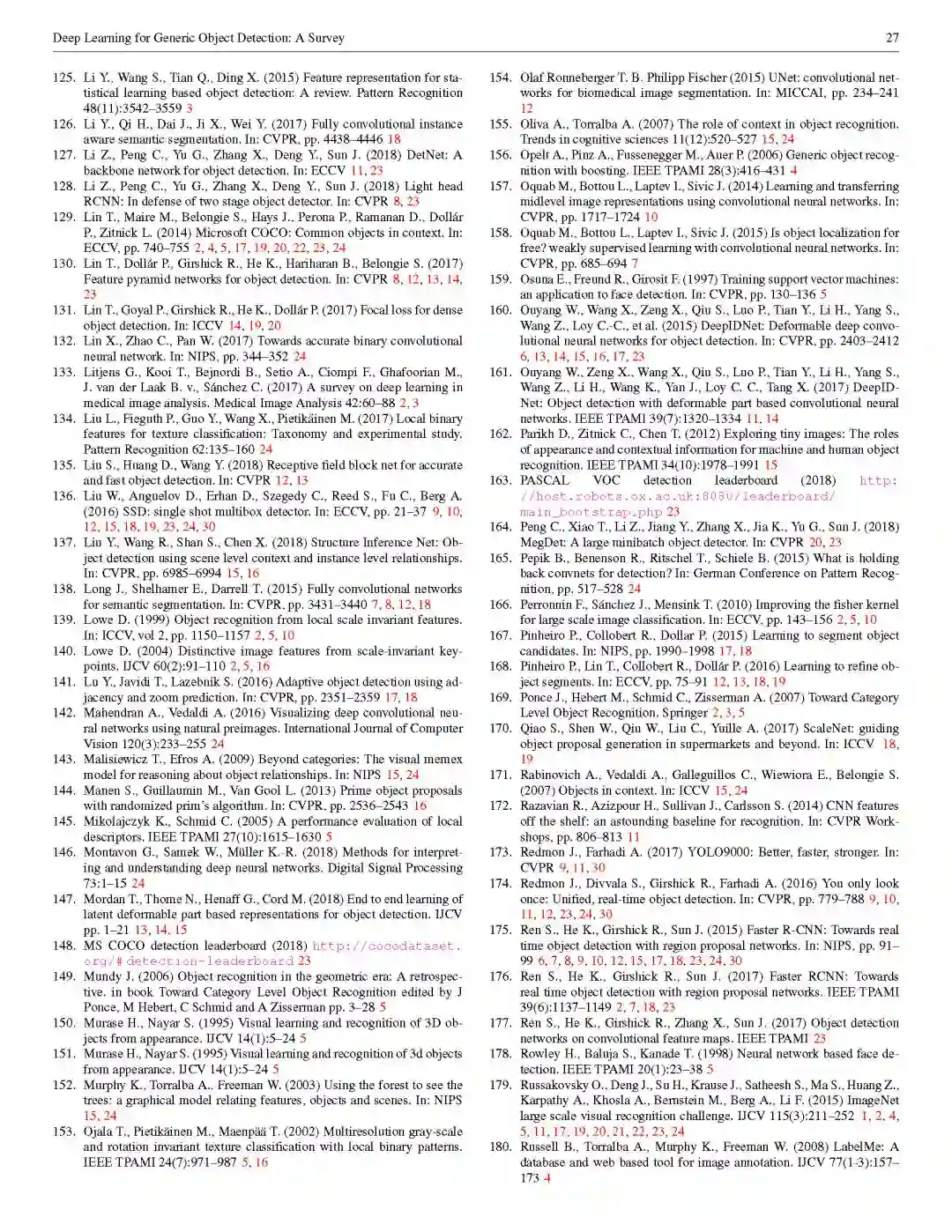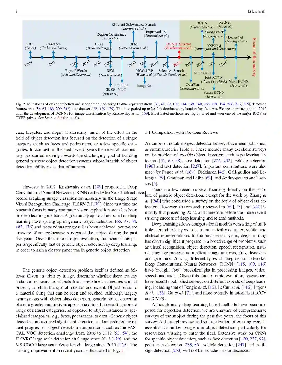 【摘要】通用目标检测旨在从自然图像中定位大量预定义类别的物体实例,是计算机视觉中最基本和最具挑战性的问题之一。近年来,深度学习技术已成为数据中学习特征表示的有力方法,并在通用目标检测领域取得了显著的突破。在深度学习快速发展的时期,本文提供对深度学习技术带来的这一领域最近成就的全面调研。本次调研包括250多项关键技术,涵盖了通用目标检测研究的许多方面:前沿的检测框架和基本子问题,包括目标特征表示,候选区域生成,上下文信息建模和训练策略等;评价问题,特别是benchmark数据集,评价指标和最先进的方法。最后,我们讨论了未来研究的方向。