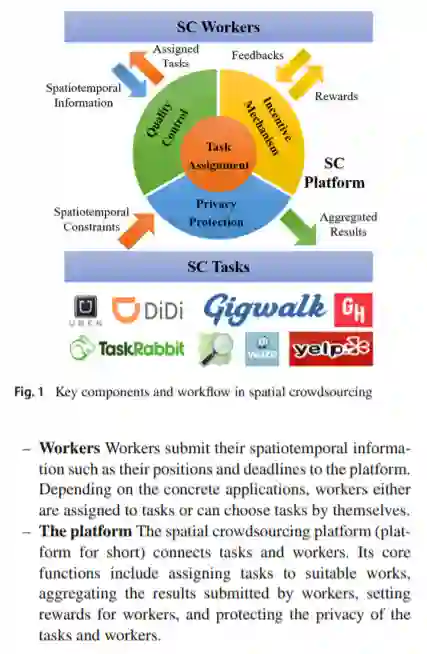 众包是一种计算范式,在这种范式中,人类积极参与计算任务,特别是那些本质上人类比计算机更容易完成的任务。空间众包是移动互联网和共享经济时代众包中日益流行的一种,任务是时空的,必须在特定的地点和时间完成。事实上,空间众包激发了最近一系列的产业成功,包括城市服务的共享经济(Uber和Gigwalk)和时空数据收集(OpenStreetMap和Waze)。本调查深入探讨了空间众包的独特性带来的挑战和技术。特别地,我们确定了空间众包的四个核心算法问题: (1)任务分配,(2)质量控制,(3)激励机制设计,(4)隐私保护。我们对上述四个问题的现有研究进行了全面和系统的回顾。我们还分析了具有代表性的空间众包应用程序,并解释了它们是如何通过这四个技术问题实现的。最后,我们讨论了未来空间众包研究和应用中需要解决的开放问题。