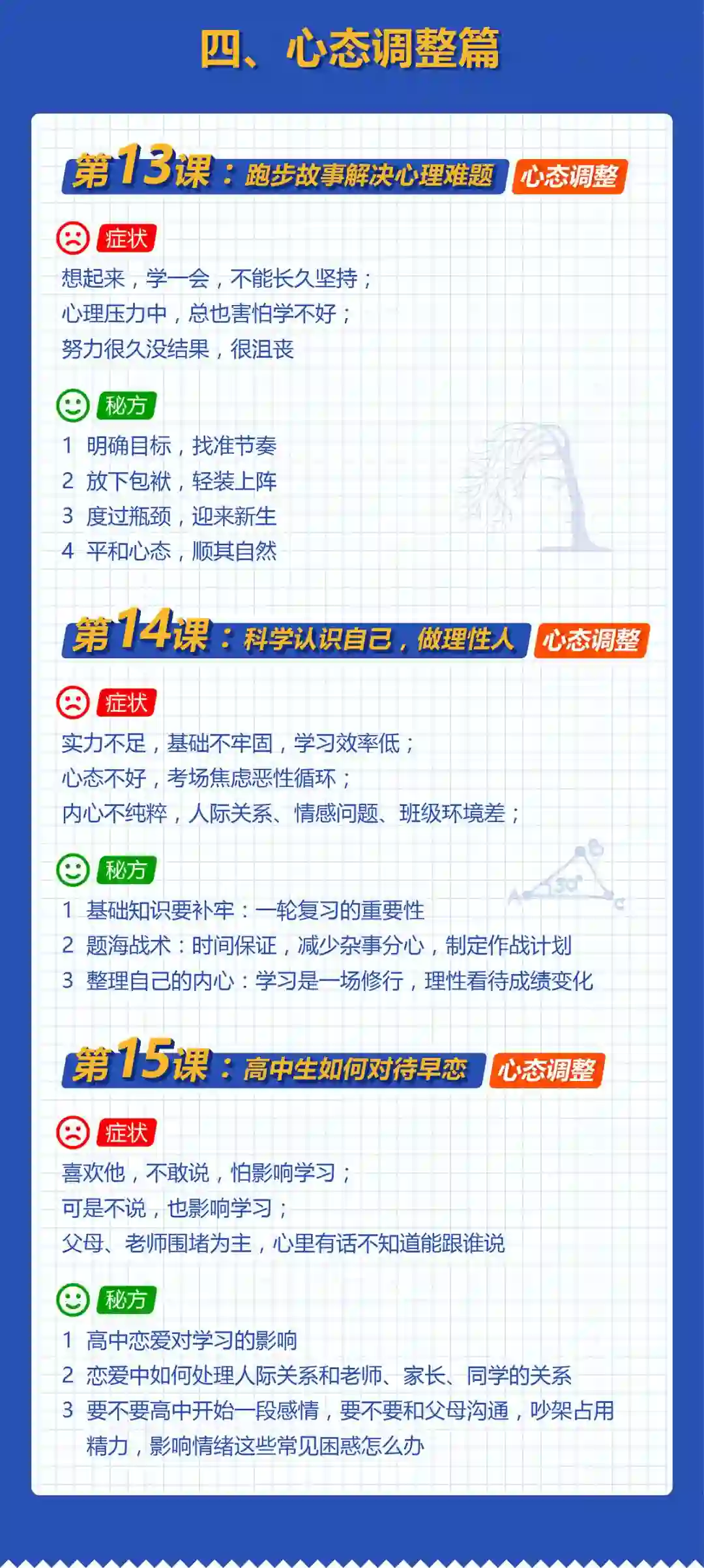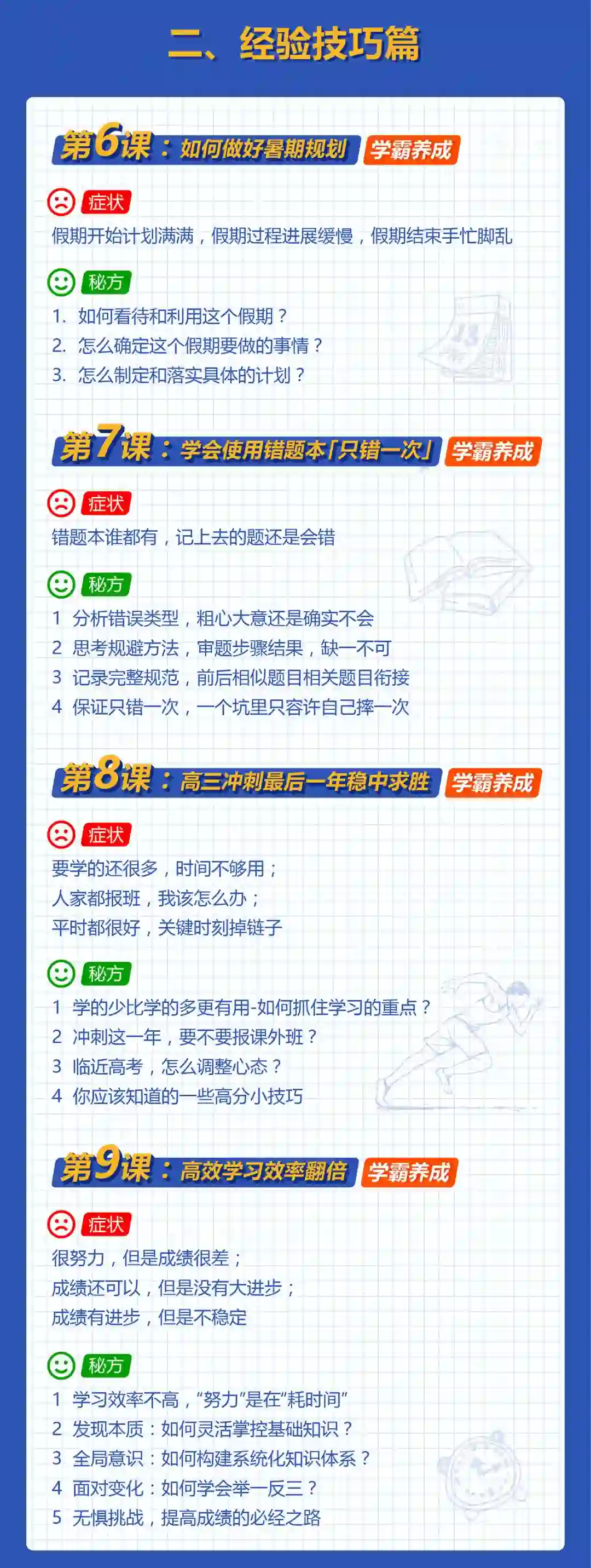 我们保证,所有的课程都是学霸的真实案例,大到学习方法,如:调节心态、高效学习法;