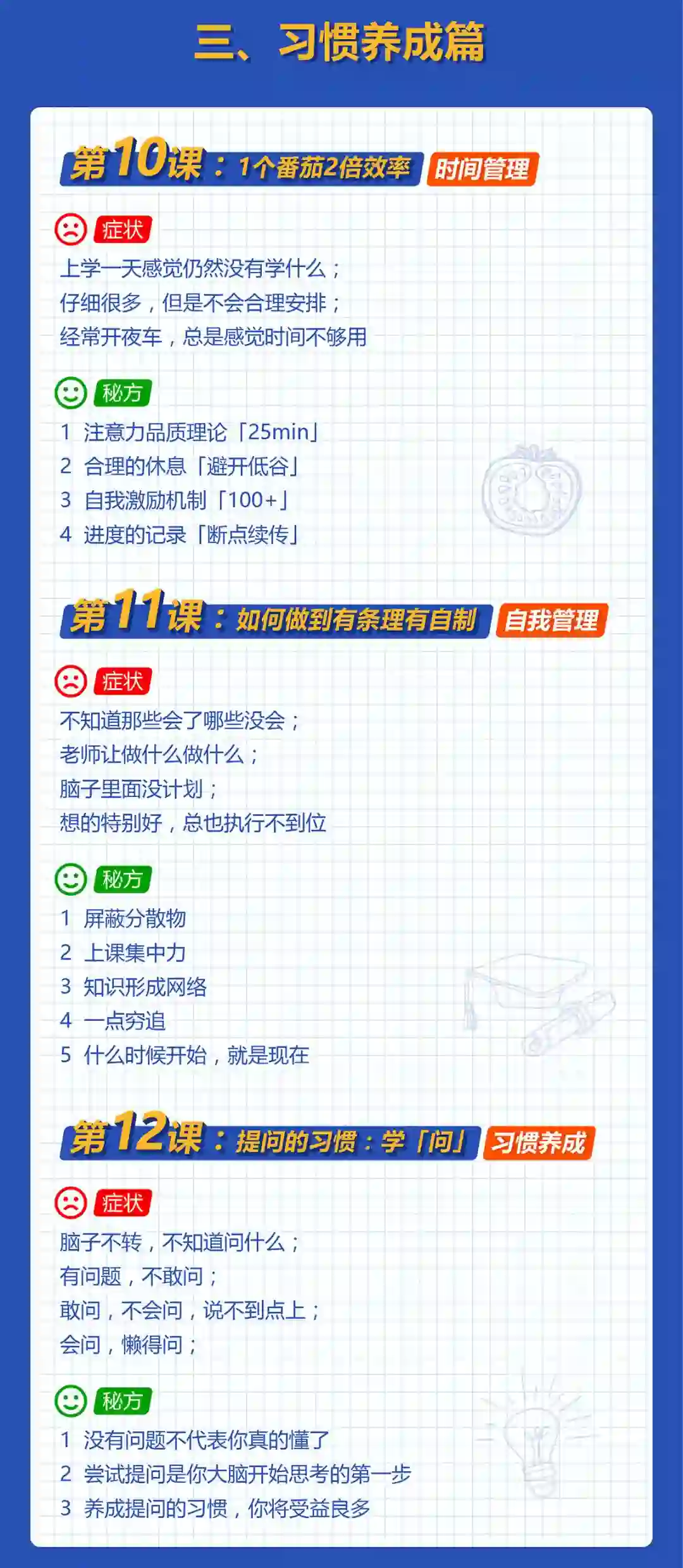 小到一个学习工具的使用,如:一个学生的日程表该如何设计,错题本如何发挥更大的效果等等。