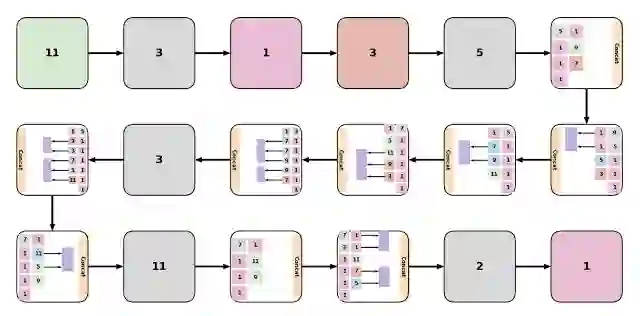 EvaNet 产生的不同架构示例。每个大彩色框和小的彩色框都代表一个网络层,框的颜色代表其类型:蓝色代表三维卷积,橙色代表(2 + 1)维卷积,绿色代表 iTGM,灰色代表最大池化,紫色代表平均,粉色代表 1x1 的卷积。各个层一般会被分组成模块(大一点的框)。每个框中的数字表示卷积核(filter)的大小。