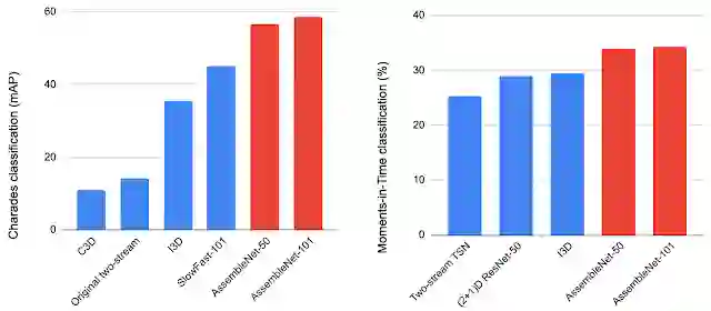 在 Charades(左)和 MiT(右)数据集上,将 AssembleNet 与最先进的手动设计的模型进行了比较。AssembleNet-50 与 AssembleNet-101 的参数量和双流 ResNet-50 与 ResNet-101 相当。