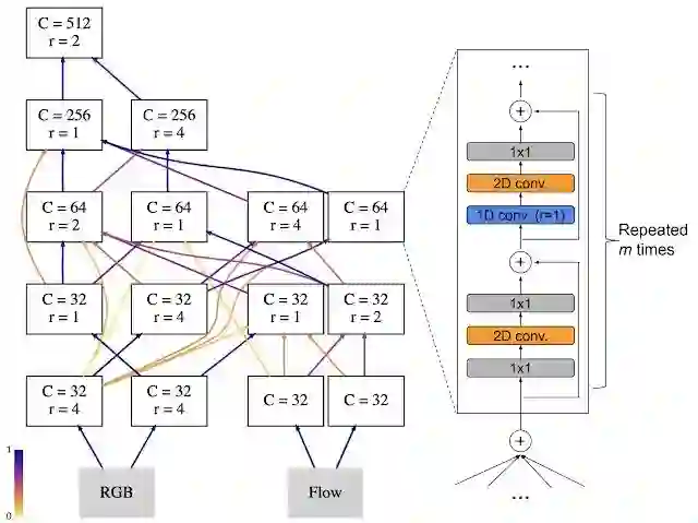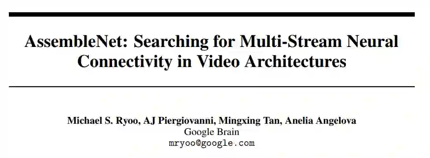 在论文「AssembleNet: Searching for Multi-Stream Neural Connectivity in Video Architectures (https://arxiv.org/abs/1905.13209)」中,我们研究了一种将具有不同输入模态(如 RGB 和光流)的不同的子网络和时间分辨率融合在一起的新方法。