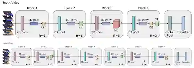 现在的深度学习模型的性能在很大程度上依赖于它们的网络架构。用于处理视频的卷积神经网络(CNN)一般是手动地将人们熟知的二维架构(如 Inception 和 ResNet)扩展成三维架构,或者是通过精心设计一种将静态表观信息和画面动态信息融合在一起的双流 CNN 架构(two-stream CNN)而实现的。然而,设计一个能够充分利用视频中的时空信息的理想视频架构仍然是一个有待探索的问题。