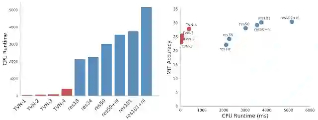 经过演化得到的 TinyVideoNet(TVN)架构,可以最大限度地提高识别性能,同时将计算时间保持在限制时间之内。例如,TVN-1(上面一列)在 CPU 上的运行时间为 37 毫秒,在 GPU 上的运行时间为 10 毫秒。TVN-2(下面一列)在 CPU 上的运行时间为 65 毫秒,在 GPU 上的运行时间为 13 毫秒。