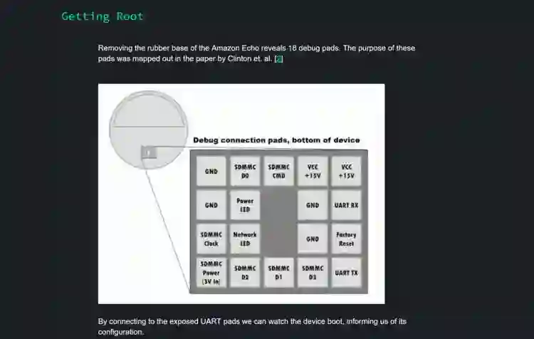 破解的方式其实非常「硬」,或者说有些「暴力」。按照马克·巴恩斯的说法,他首先需要将 Echo 拆开,是通过拆除掉音箱底部的一个金属焊盘来实现,拆下焊盘之后,通过插入 SD 卡的方式,将原来的 Echo 固件改写,这就需要提前将 SD 卡内放入一个新的用于控制的「引导程序」,从而关闭原本操作系统中的身份验证,并且能够允许设备开放使用其他未经授权的软件。