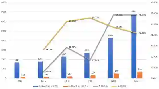 根据推算,全球人工智能市场将在2020年达到6800 亿元,复合增长率达26.2%。2017年,中国人工智能市场规模已达到了216.9亿元,同比增长52.8%。到2020年,中国在人工智能的市场规模将达710亿元,2015年到2020年间复合增长率为44.5%。