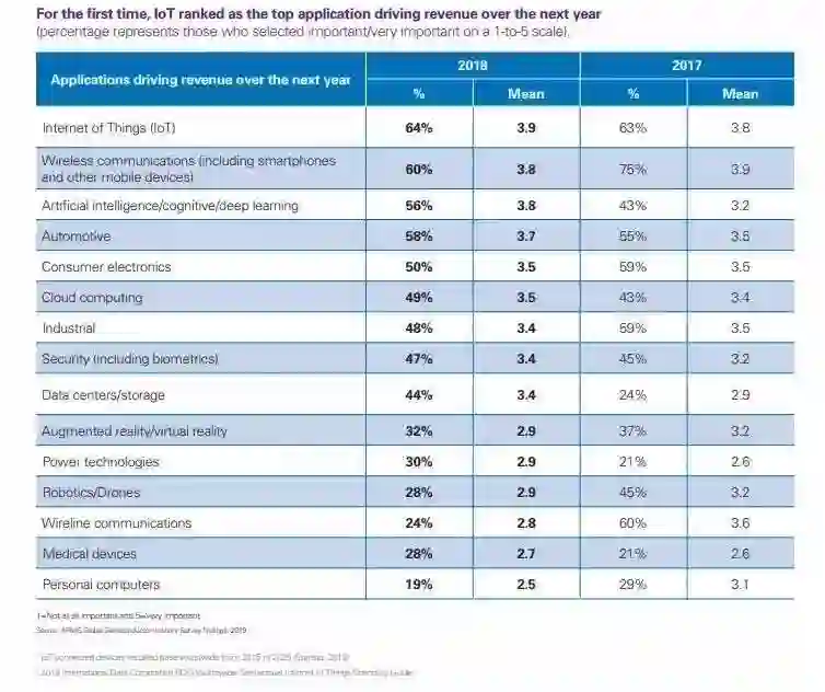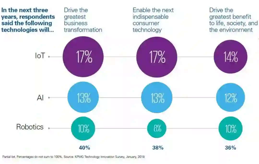 不久之前,毕马威发布的另一份市场研究,《2018全球科技创新报告》中,调查了超过750名全球科技行业领袖的意见。最终,在一堆令人眼花缭乱的科技新名词中,物联网IoT脱颖而出,位居新兴技术榜首。