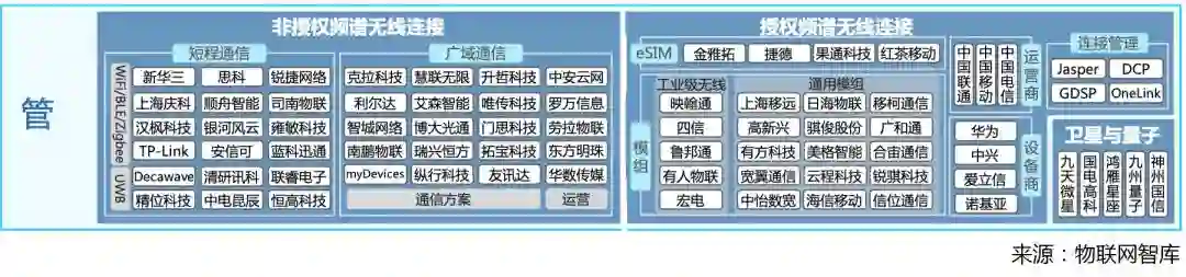 运行在授权频谱上的通信方式一般都是由各大运营商来掌握,但是产业链还包括设备制造(芯片、模组、网关、基站、智能设备)、技术服务商、解决方案提供商等多重角色,各环节企业各司其职、相辅相成,使得授权频段上运行的物联网技术能够在各行业应用中落地。