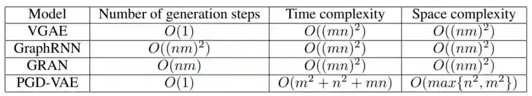 首先作者分析了 PGD-VAE 和对比模型,包括 VGAE、GraphRNN、GRAN 的时间和空间复杂度。由表 1 可得,相比其他对比模型,PGD-VAE 拥有最低的空间复杂度和时间复杂度