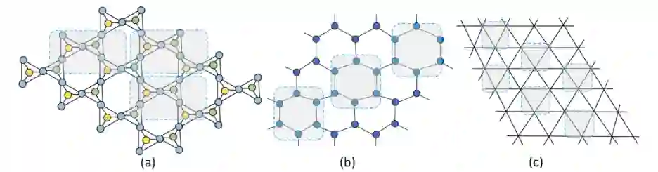 图 1:周期图示例,基本单元被标出:(a) 鳞石英结构;(b) 石墨烯结构;(c) 三角形网格结构。