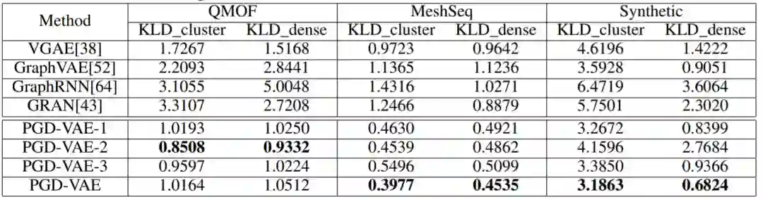 表 2:PGD-VAE 和对比模型在 QMOF、MeshSeq 以及合成数据上的表现。其中 PGD-VAE-1 为 PGD-VAE 去掉正则项;PGD-VAE-2 为 PGD-VAE 由 GCN 代替 GIN;PGD-VAE-3 代表使用单一的 MLP 代替三个解码器直接生成。