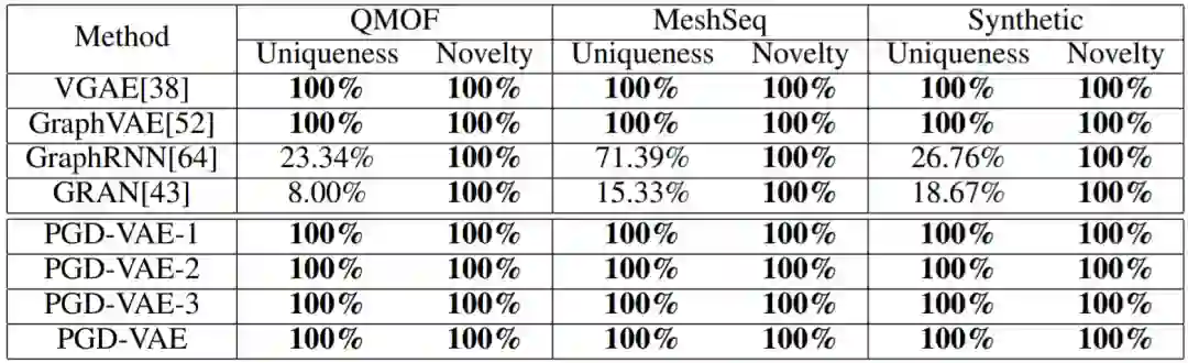 表 3:PGD-VAE 和对比模型在 QMOF、MeshSeq 以及合成数据上的数据生成质量。