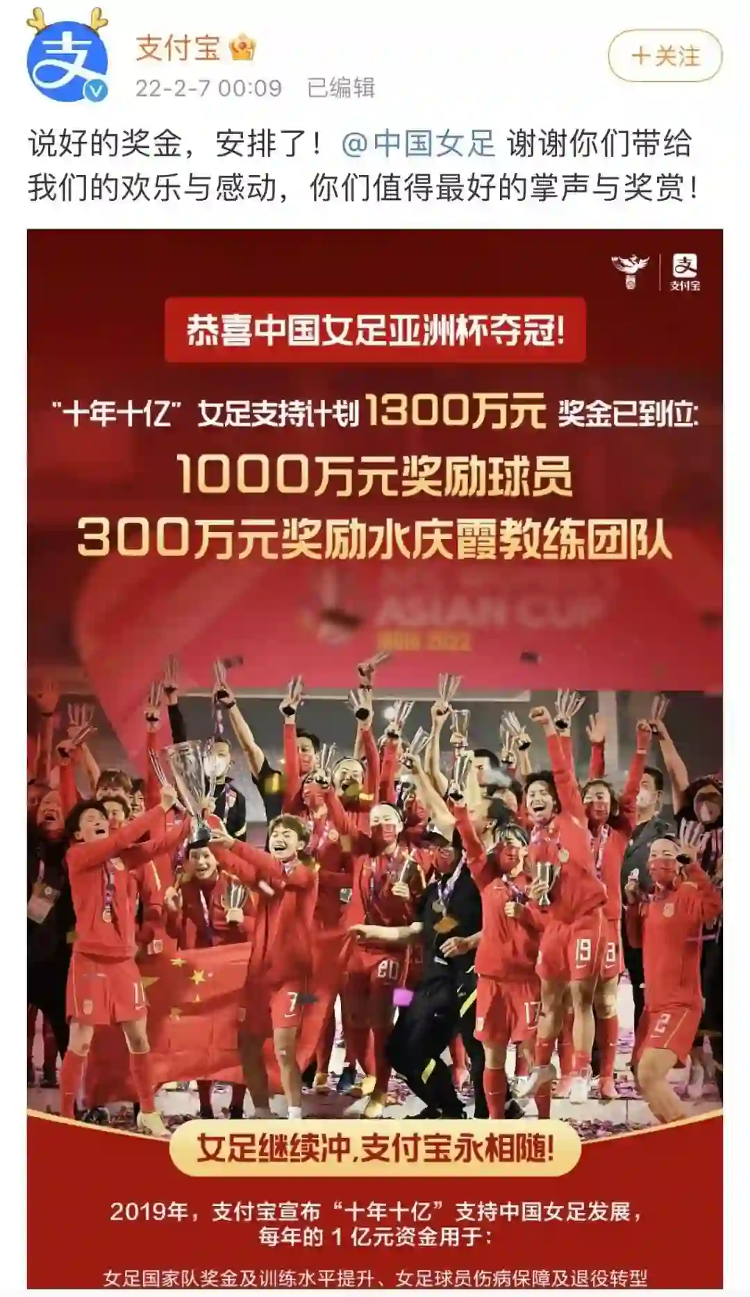 【蒙牛、支付宝千万奖励中国女足夺冠】2月6日晚,中国女足3比2战胜韩国队,第9次捧起亚洲杯冠军奖杯。中国足协中国之队官方合作伙伴@蒙牛乳业首个宣布,给予中国女足1000万元现金奖励。7日凌晨,@支付宝官宣给女足1300万奖金,其中1000万奖励球队,300万给水庆霞教练团队。(每日经济新闻)