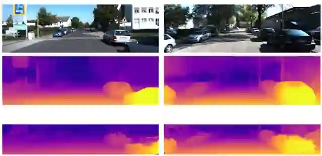 中间行是 KITTI 数据集中的单目视频输入深度预测,与光学雷达传感器测得的实际深度相比,后者未能涵盖完整场景,并且会丢失值且存在噪声值。我们未在训练期间使用实际深度