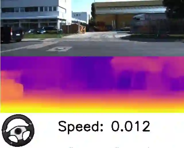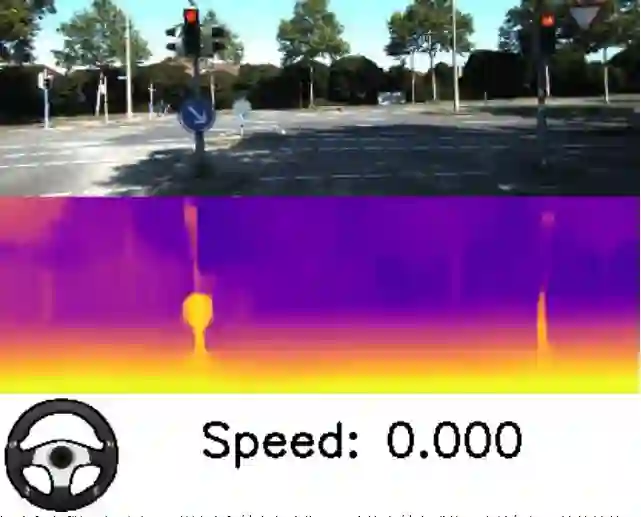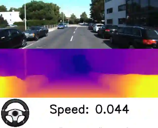 深度和自我运动预测。跟随速度和转向角度指示观察汽车转向或停下来等红灯时的估算值