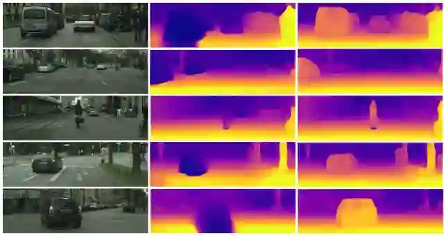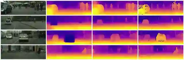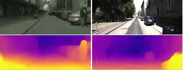 除了这些成果以外,此项研究还为进一步探究无监督学习方法能够取得哪些成果提供了动力,因为相比于立体或光学雷达传感器,单目输入的成本更低,也更易于部署。如下图所示,在 KITTI 和 Cityscapes 数据集中,监督传感器(无论是立体传感器还是光学雷达传感器)会丢失值,而且有时候可能与摄像机输入存在偏差,这是由延时造成的情况。