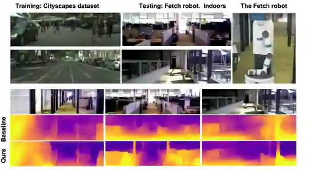 我们在明显不同的数据集和环境中进一步测试,即在由 Fetch 机器人收集的室内数据集中进行测试,但在城市户外驾驶 Cityscapes 数据集中进行训练。不出所料,这些数据集之间存在巨大差异。尽管如此,我们发现在线学习技术能够获取比基线更准确的深度估算。