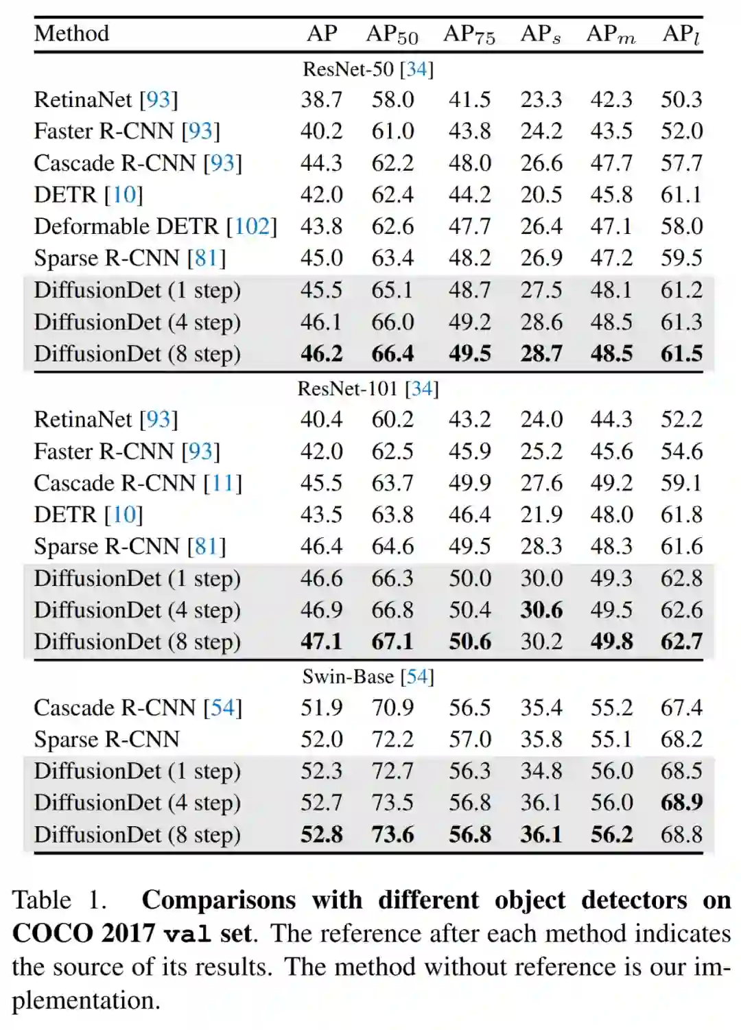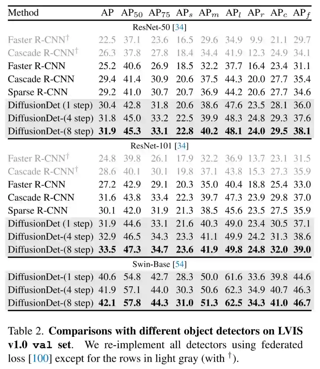 下表 2 中展示了在更具挑战性的 LVIS 数据集上的结果,可以看到,DiffusionDet 使用更多的细化步骤可以获得显著的增益。