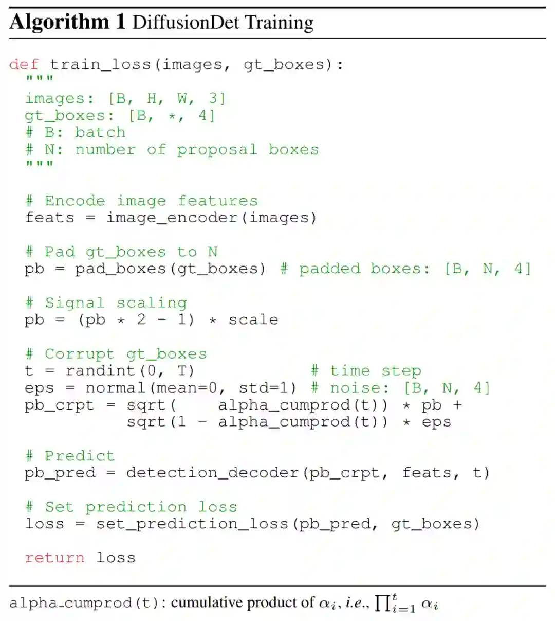 在训练过程中,研究者首先构建了从真值框到噪声框的扩散过程,然后训练模型来反转这个过程。如下算法 1 提供了 DiffusionDet 训练过程的伪代码。